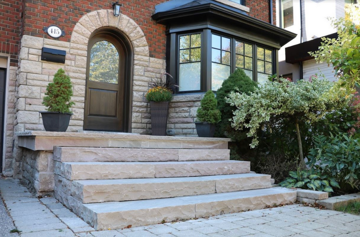 Banas Stones® Risers add the elegance of natural stone to outdoor stairs, garden steps, and patio transitions. These 1" thick stone risers are designed to finish the vertical face of a step, pairing with stone or porcelain treads to create a clean, cohesive stair system. Each piece is carefully rock-faced and hand-finished by skilled craftsmen, delivering organic texture, natural movement, and a refined architectural look.