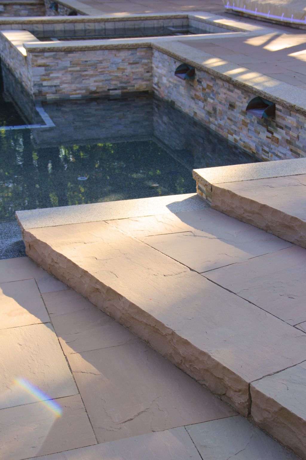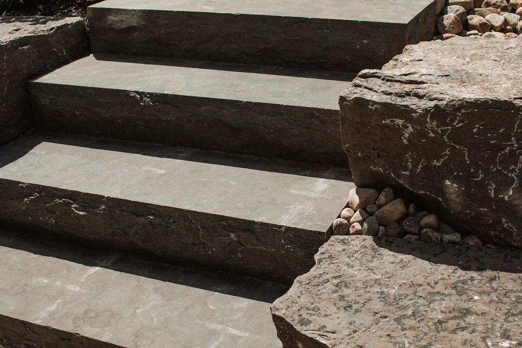 Banas Stones® steps add the elegance of natural stone steps in your garden or patio by using our well crafted and hand dressed risers. These steps are carefully rock faced and finished by craftsmen that create an organic beauty and natural flow.