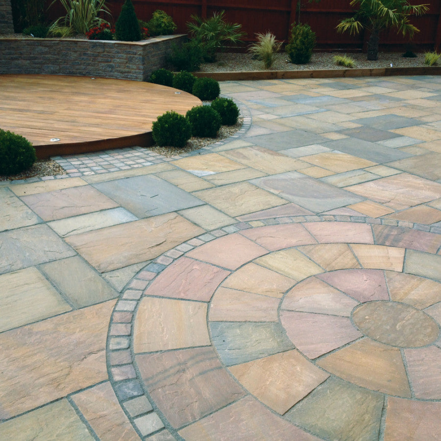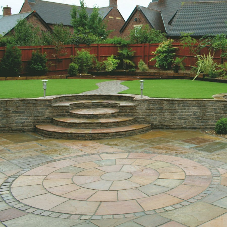 Natural Paving's cleft natural sandstone has the beauty and hard-wearing qualities of real stone to add timeless appeal to any landscape. The colors and textures have formed naturally since time began which give each skillfully crafted piece its own wonderfully unique qualities. This hand split naturally riven paving circle feature kit creates an interesting focalpoint within a paved area or works equally well as a standalone feature