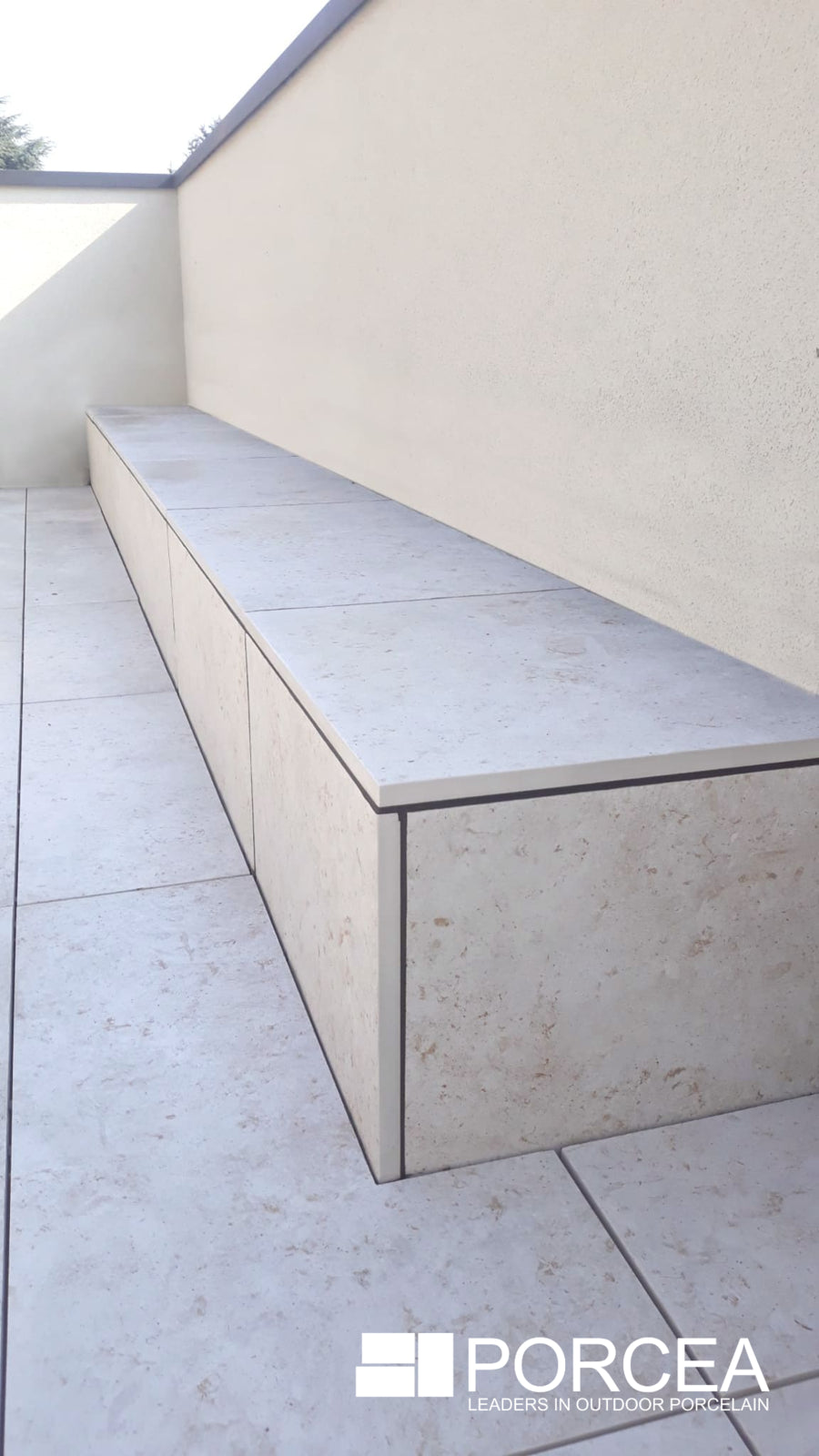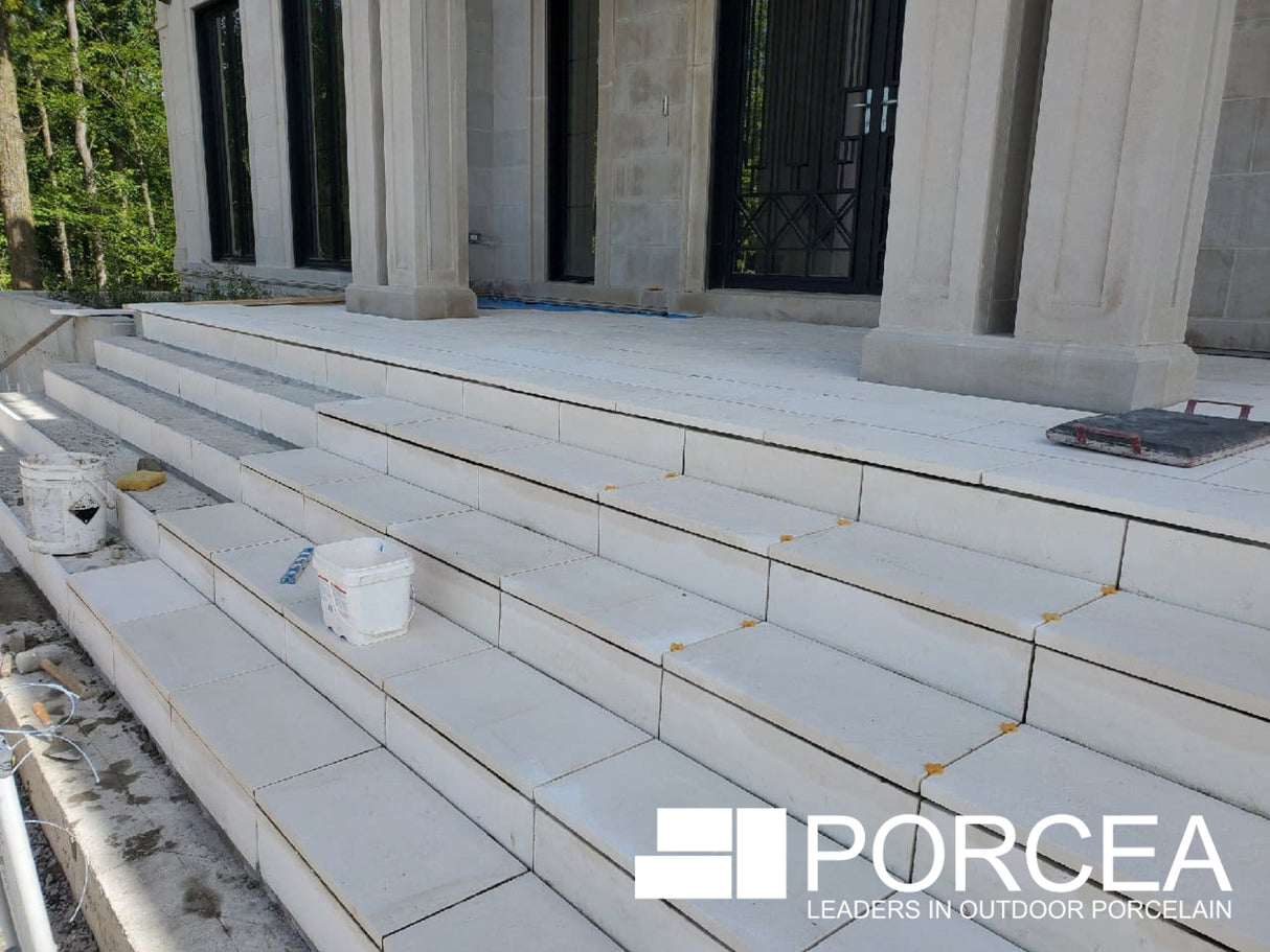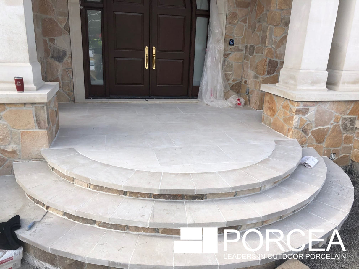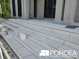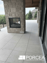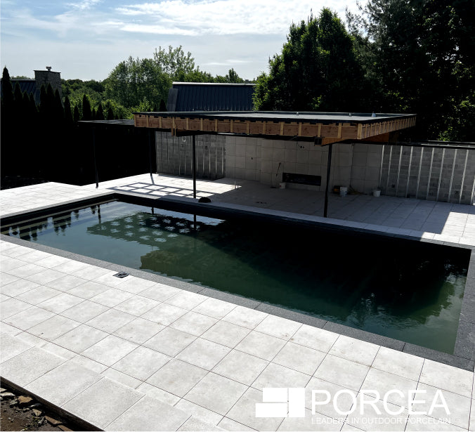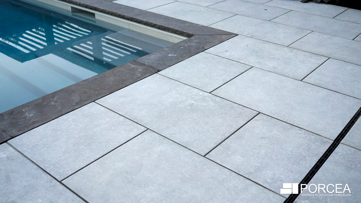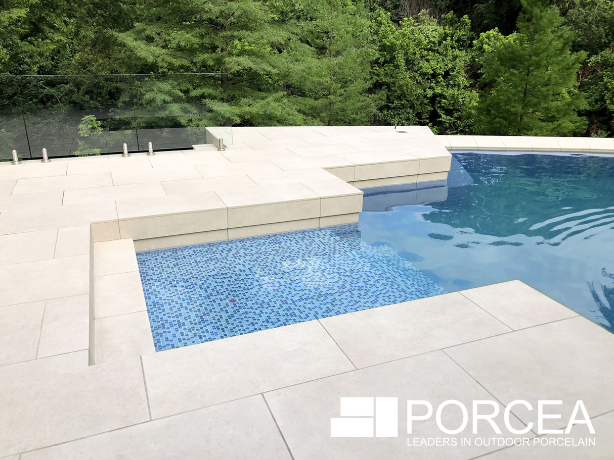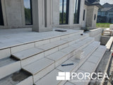 It has a sandblasted texture with a light cream colour tone that is stain-resistant and maintenance-free. The colour tone is lighter than our Porcea Coast, with a very subtle off-white colour tone that works perfectly with Indiana limestone masonry. Porcea Amalfi is the best outdoor porcelain tile to match with natural stone copings such as Algonquin Limestone Sandblasted.