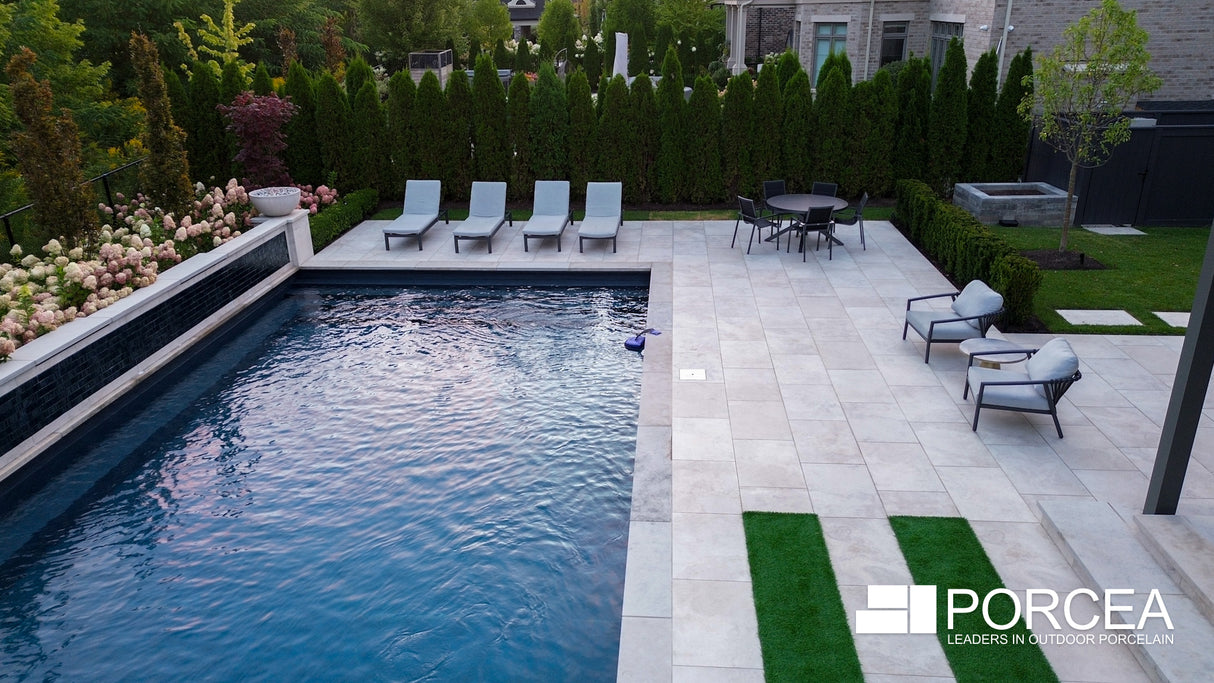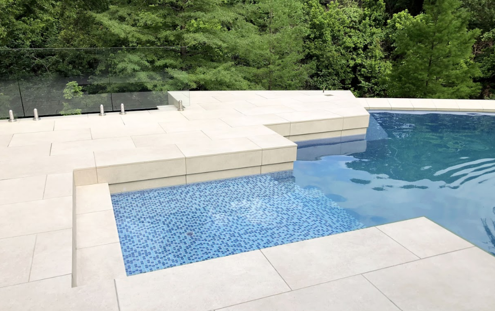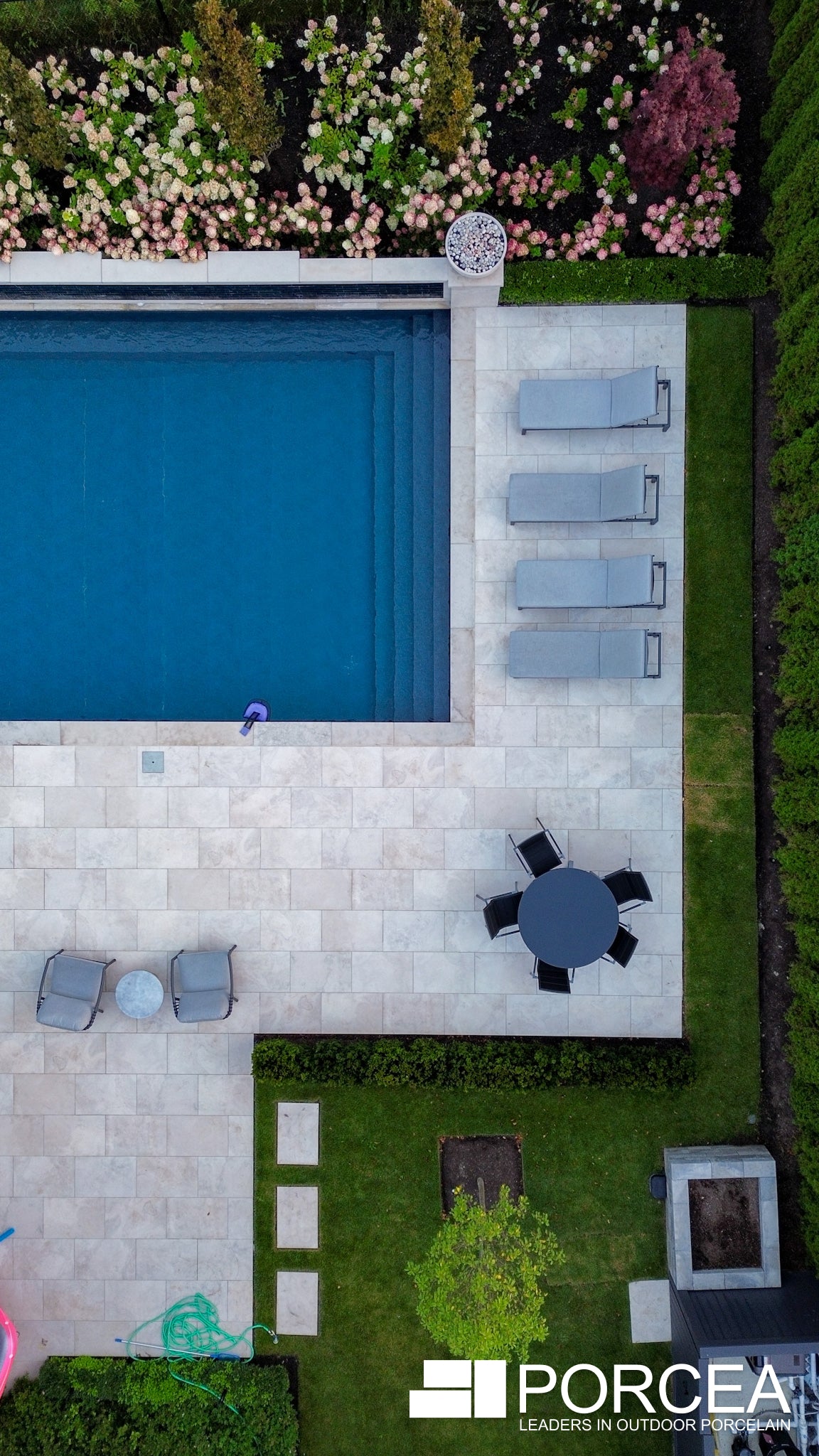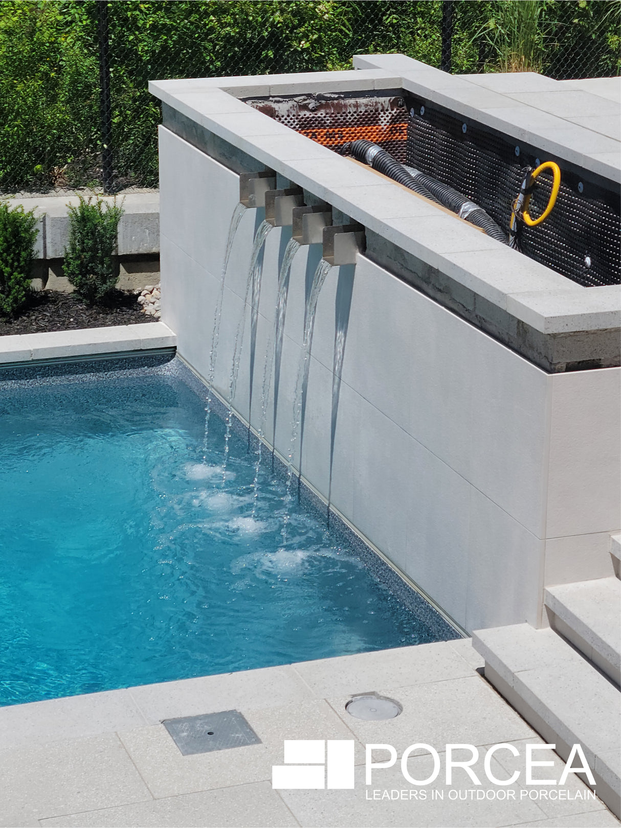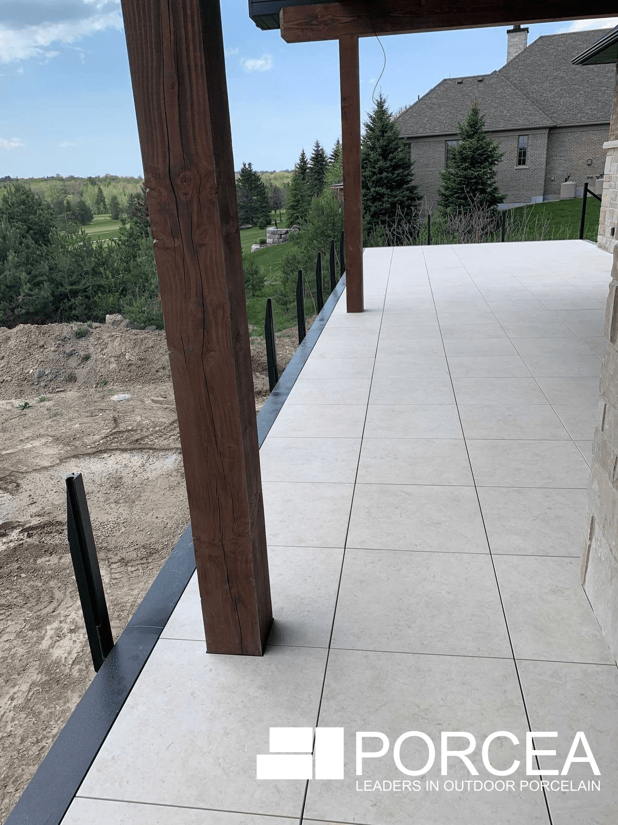 It has a sandblasted texture with a light cream colour tone that is stain-resistant and maintenance-free. The colour tone is lighter than our Porcea Coast, with a very subtle off-white colour tone that works perfectly with Indiana limestone masonry. Porcea Amalfi is the best outdoor porcelain tile to match with natural stone copings such as Algonquin Limestone Sandblasted.