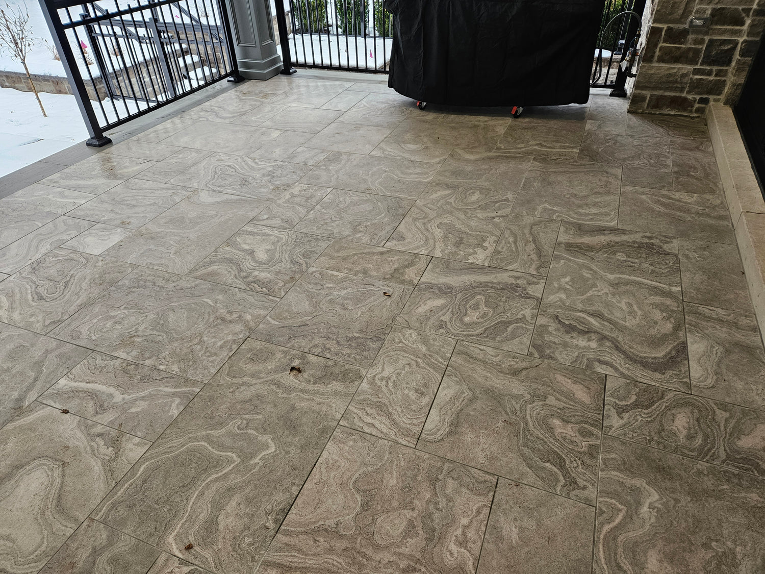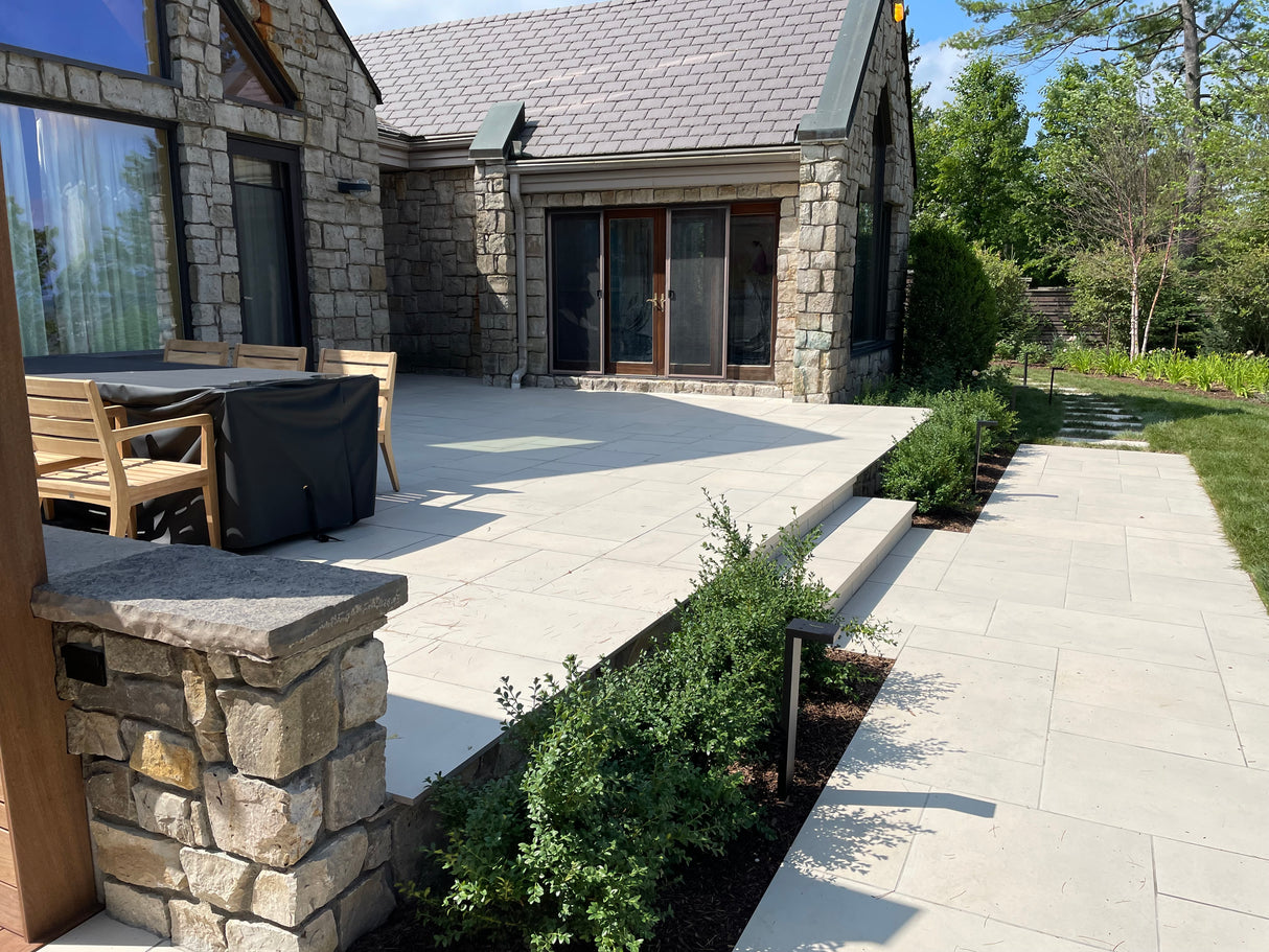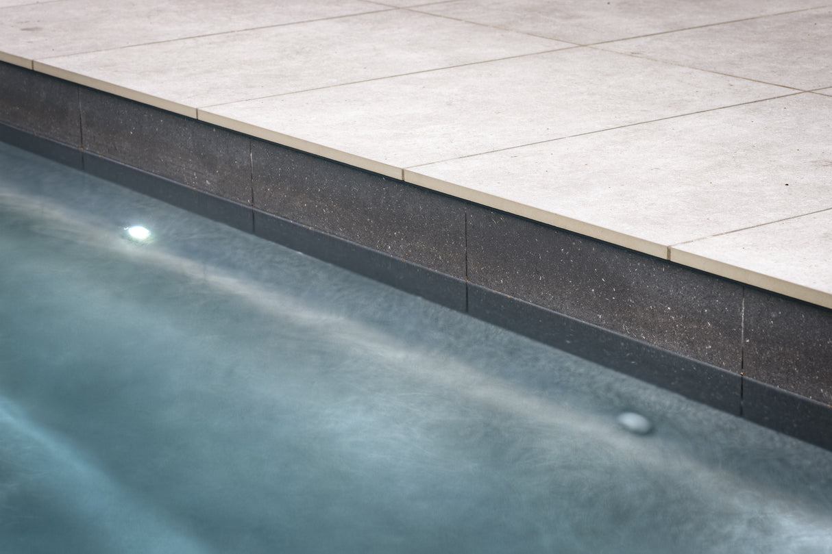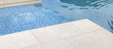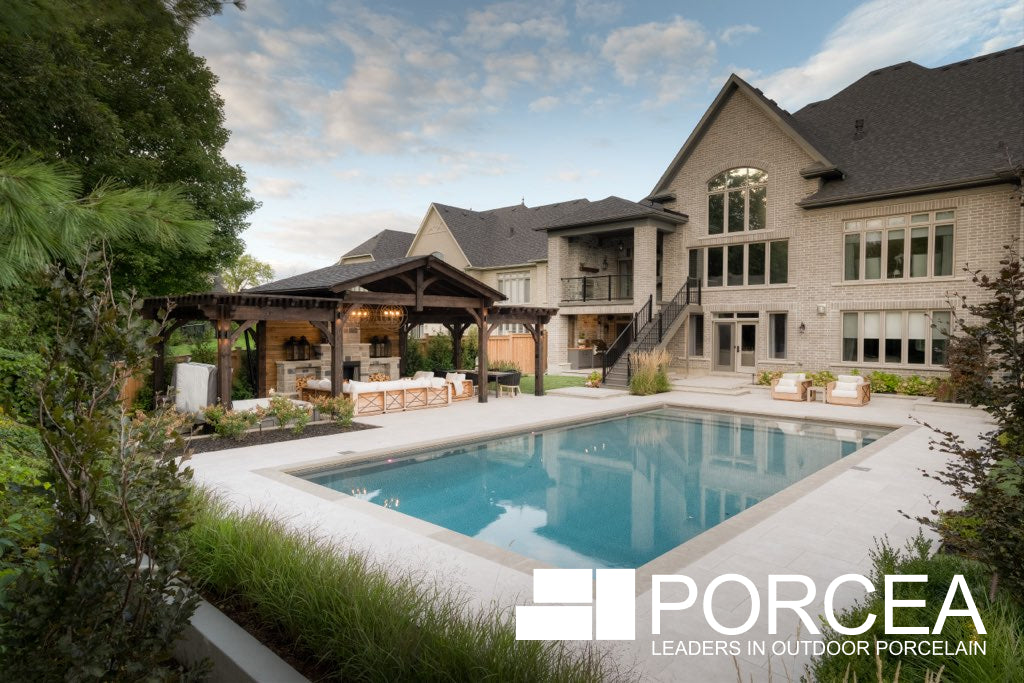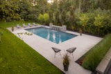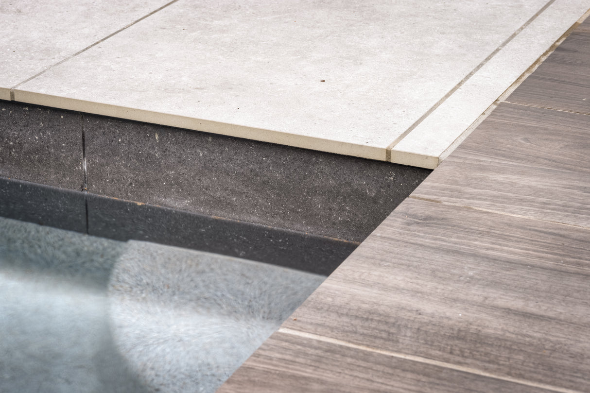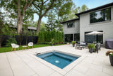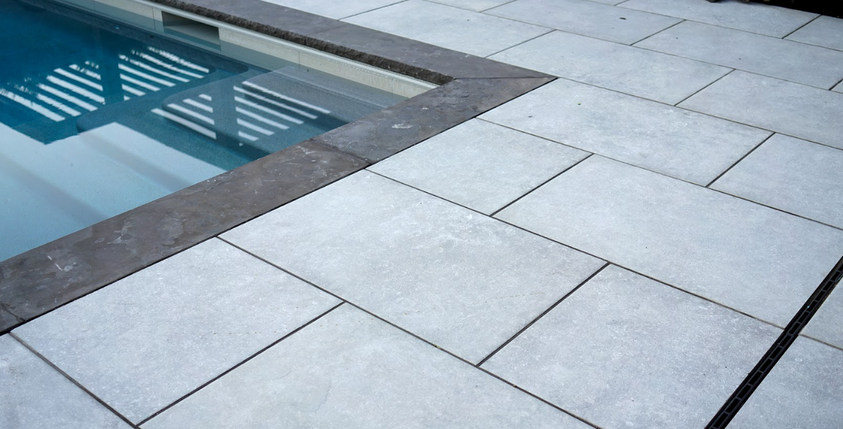 It has a sandblasted texture with a light cream colour tone that is stain-resistant and maintenance-free. The colour tone is lighter than our Porcea Coast, with a very subtle off-white colour tone that works perfectly with Indiana limestone masonry. Porcea Amalfi is the best outdoor porcelain tile to match with natural stone copings such as Algonquin Limestone Sandblasted.