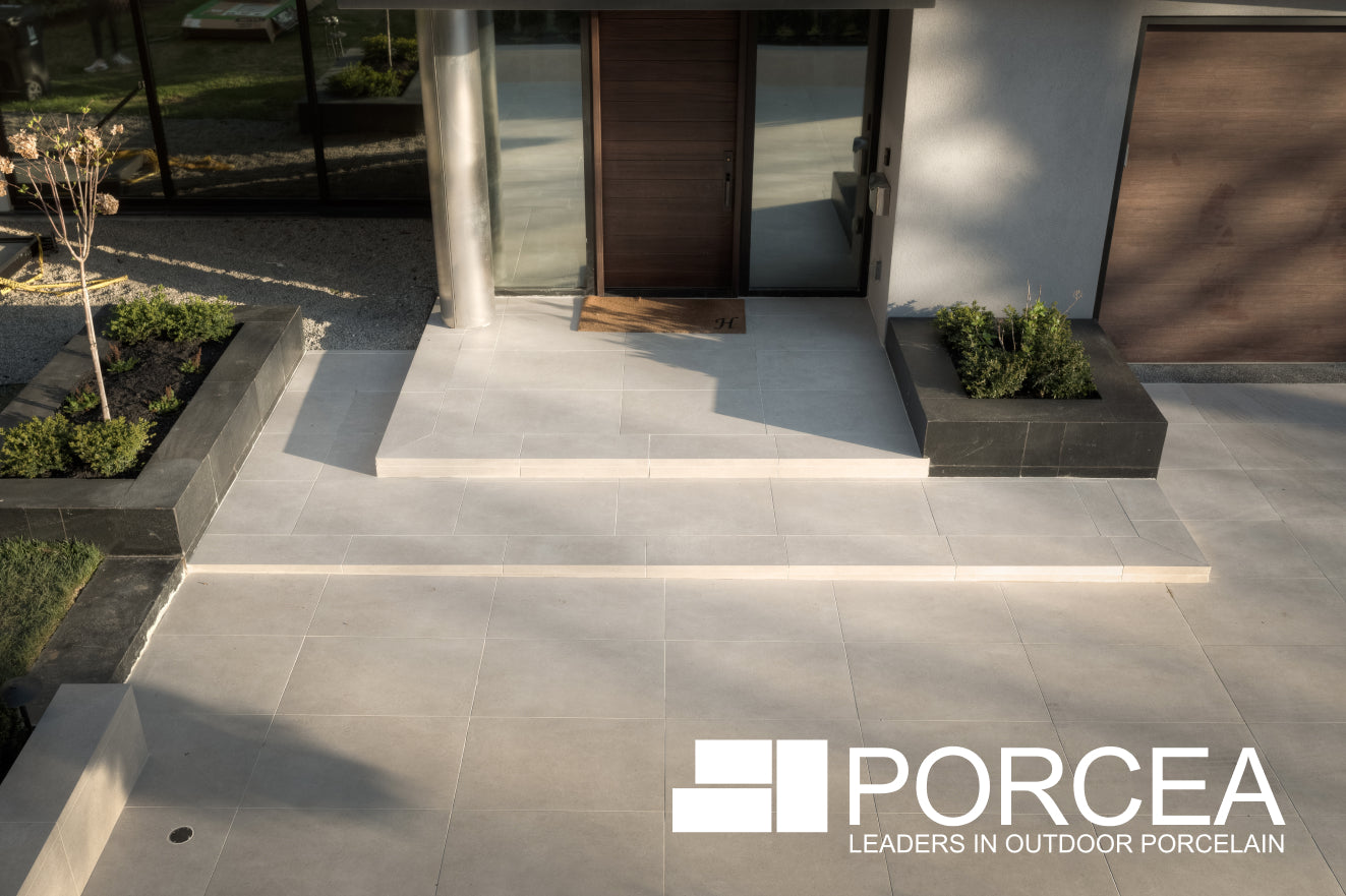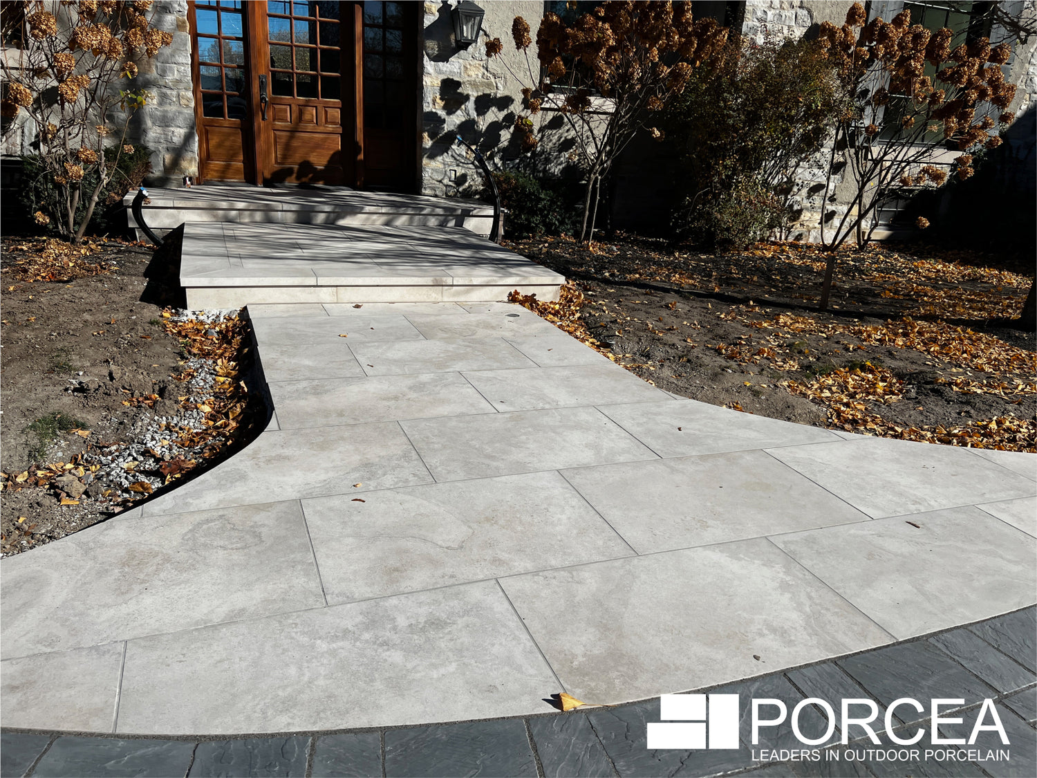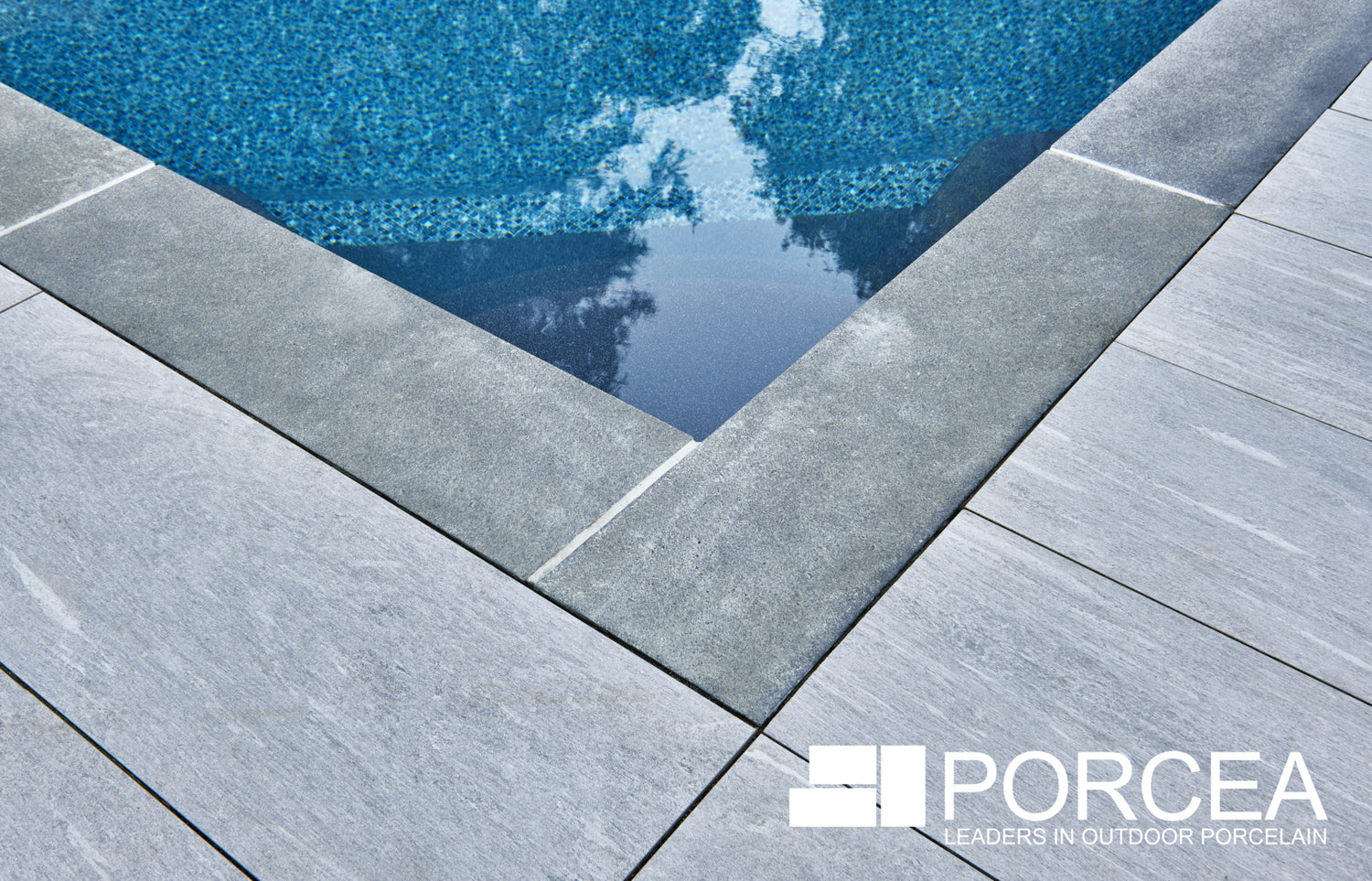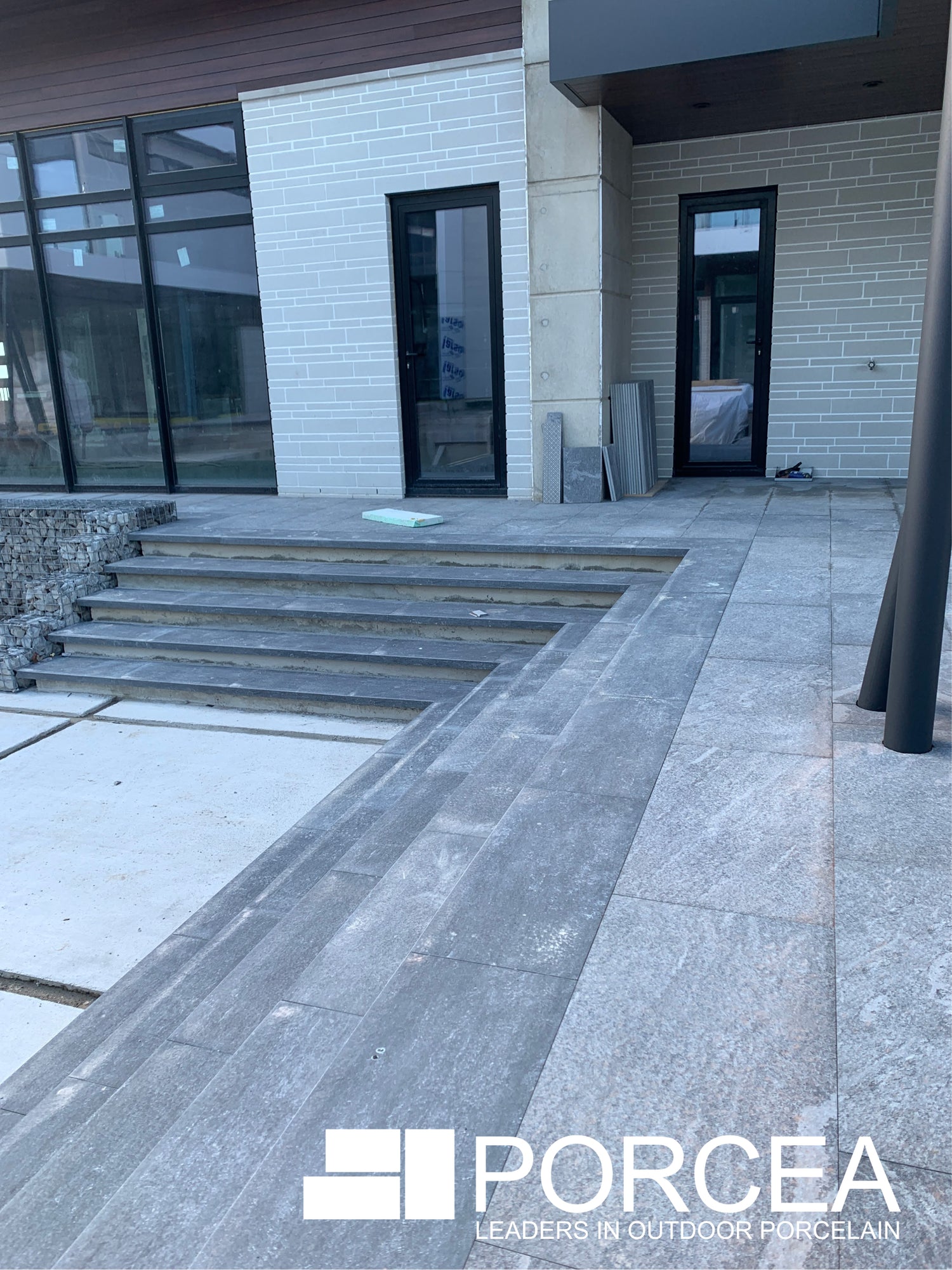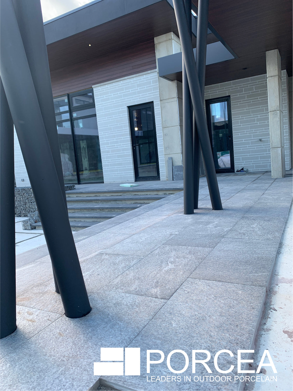 It is an outdoor porcelain tile that is the perfect match to Dove Grey or Blue Ice sandstone. These stones are widely accepted already in North America. Porcea Ice Grey can work perfectly for any entrance walkway or patio area, alongside natural stone copings to match.