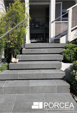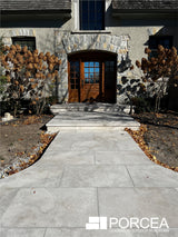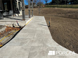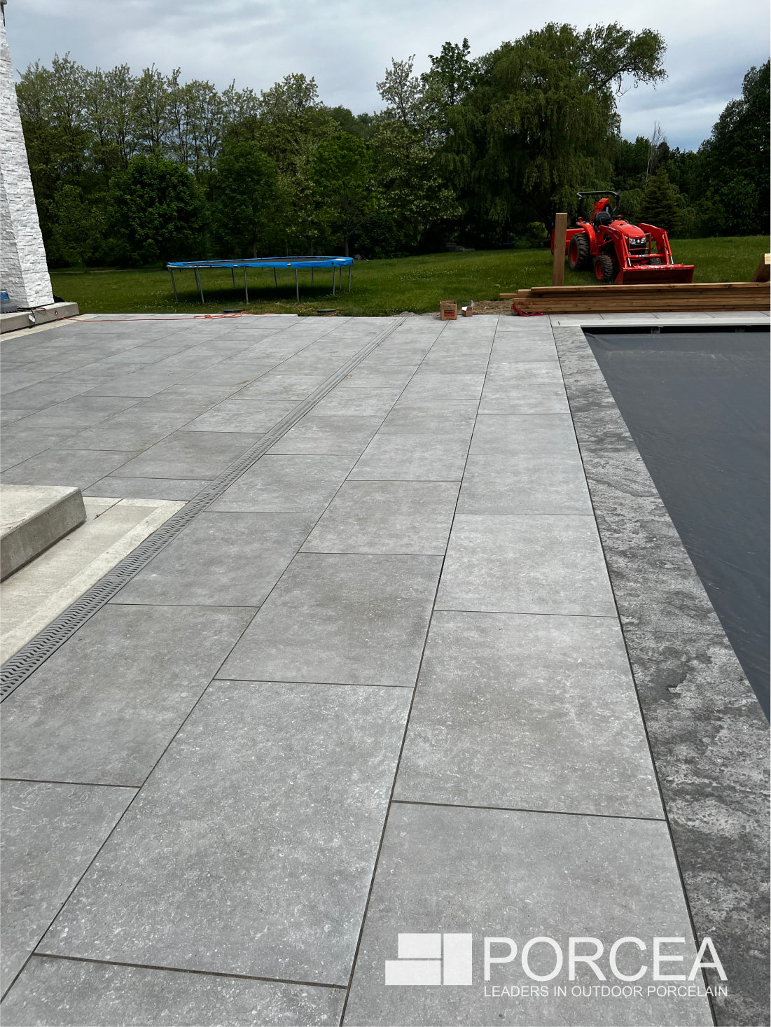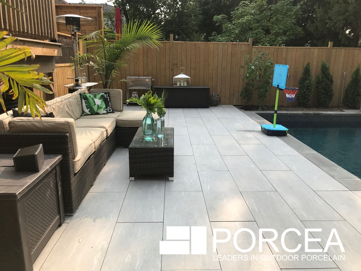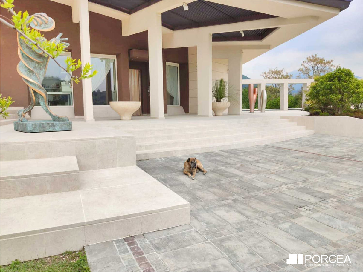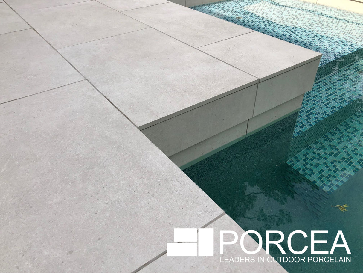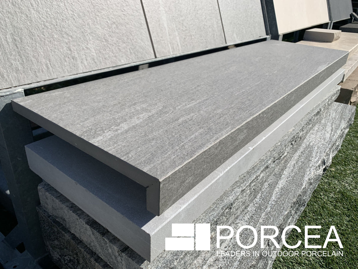 It is an outdoor porcelain tile that is the perfect match to Dove Grey or Blue Ice sandstone. These stones are widely accepted already in North America. Porcea Ice Grey can work perfectly for any entrance walkway or patio area, alongside natural stone copings to match.
