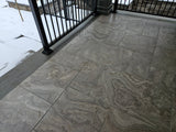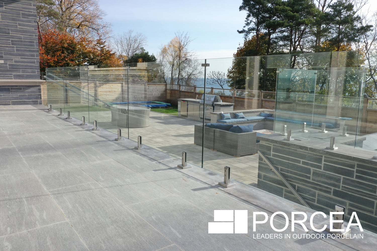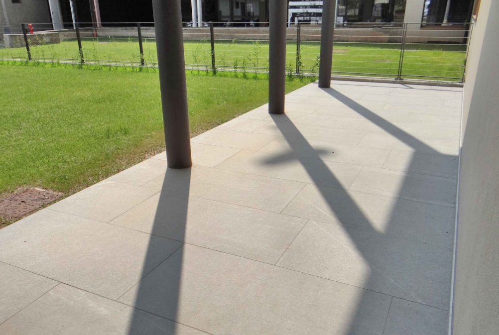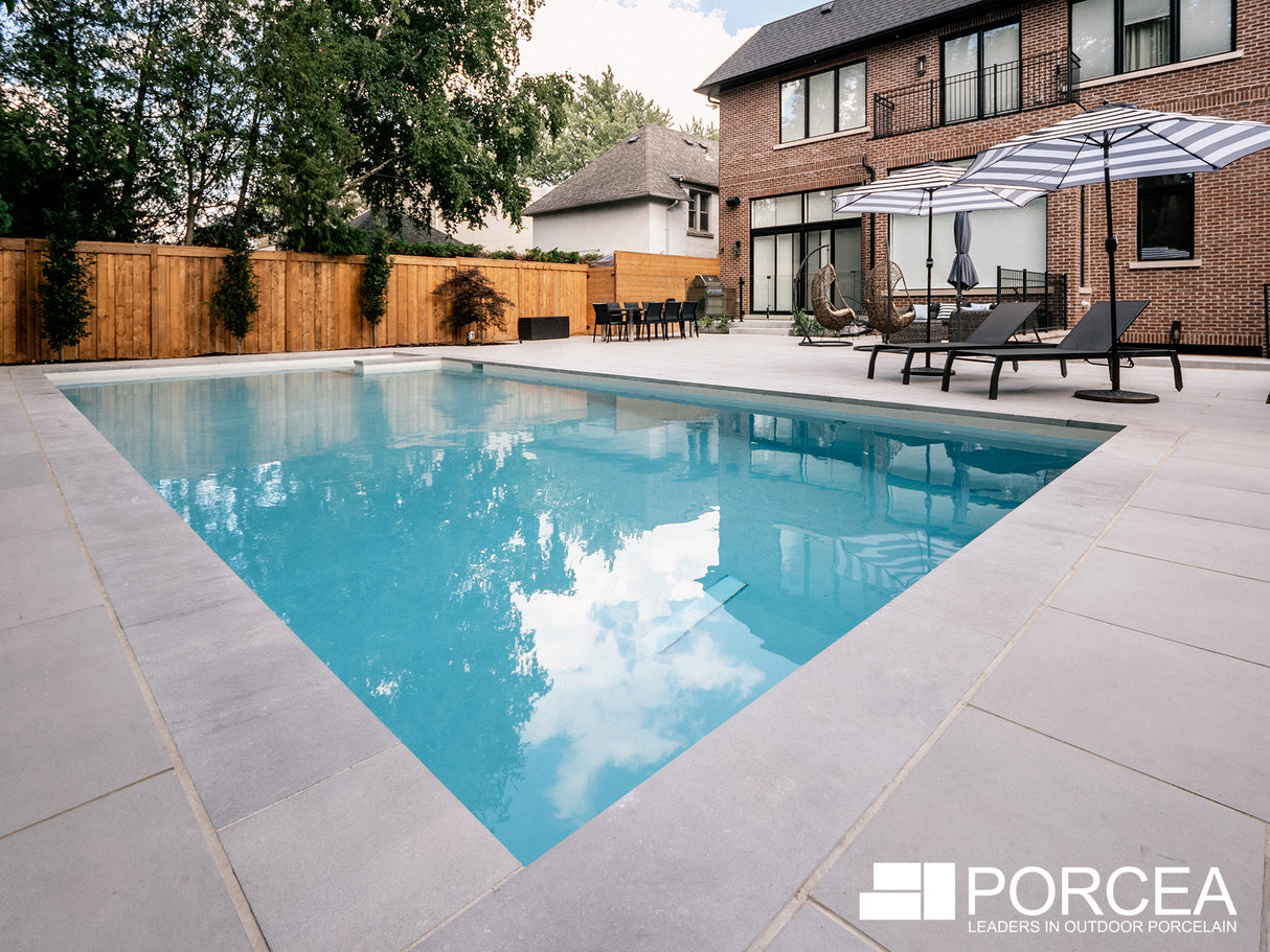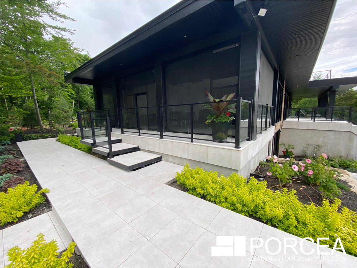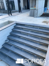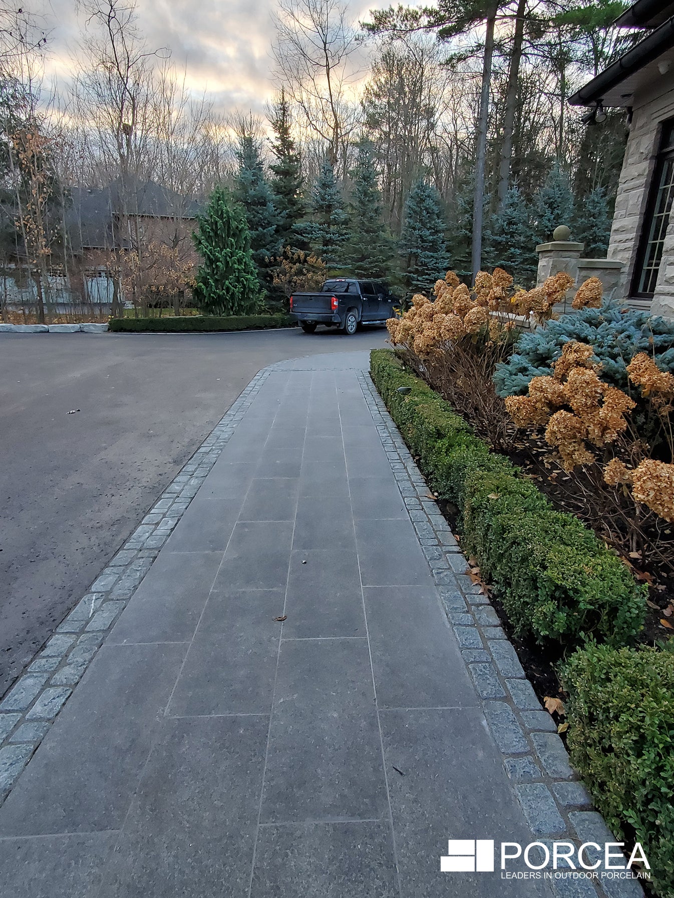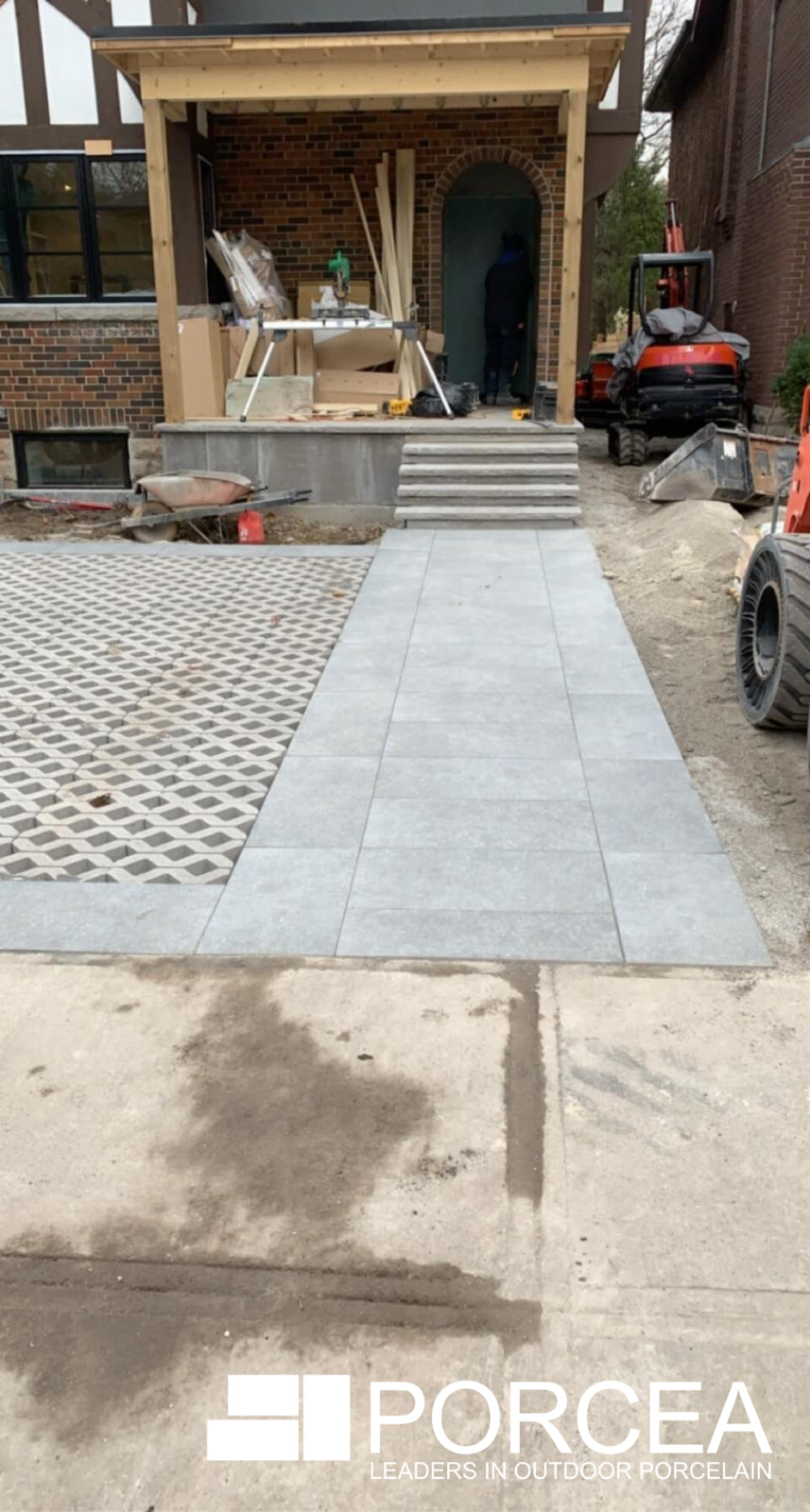 It is an outdoor porcelain tile that is the perfect match to Dove Grey or Blue Ice sandstone. These stones are widely accepted already in North America. Porcea Ice Grey can work perfectly for any entrance walkway or patio area, alongside natural stone copings to match.