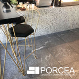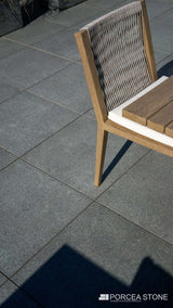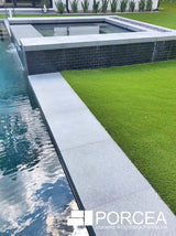Porcea Nero is the closest match to black granite in porcelain tiles that is available in North America. It has a slight texture, a beautiful sparkle that is traditionally achieved from flaming natural stone, and it is suitable for all outdoor applications.